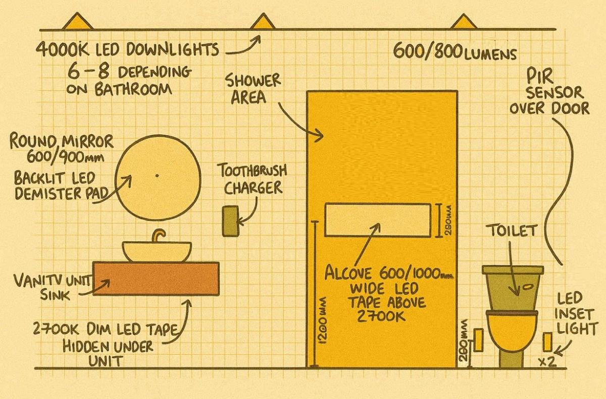 General Illumination: A set of 4000K LED downlights provides the clean, bright light you need for daily tasks. The quantity (6-8) depends on the size of your bathroom. These should have a high lumen output, around 600-800 lumens, to ensure the space is well-lit.