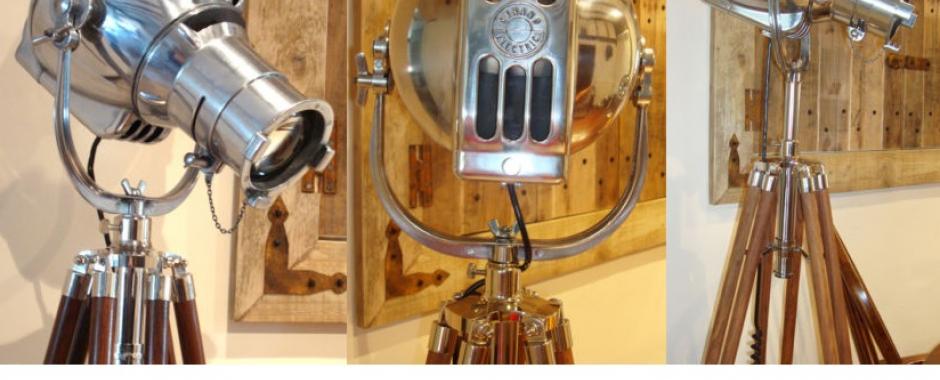 We have a great choice of vintage stage lighting, converted into floor standing lamps using beautiful wooden tripods. Prices start from £350 inc Vat with free home delivery. All our vintage lighting is sourced from around the UK then fully cleaned and restored in our workshop. Each item is fitted with vintage twisted antique style cable and fully tested. Our Patt 23 stage spotlights are fitted with new CFL lamps which are equal to 125 watts this means they still produce a lovely bright spot just like they would have done with their original 250 watt super bright spot bulbs. The only difference is they dont get red hot now and the lamps last 8,000 hours. We have many restored stage lights in our showroom and all are available for next day UK delivery. They would look great in any shop window or as a decorative feature light in a lounge or dinning room. These old Patt 23 film spots are between 40-50 years old so they all have a great history and are very unusual each in there own way. Check out the range of genuine vintage light fitting we currently have listed on our website now.