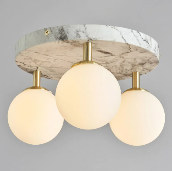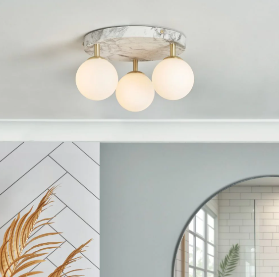 Add sculptural elegance to your room with the Marble 3 Light Bathroom Flush Ceiling Light. Featuring a marble finished ceiling plate and three opal glass shades with satin brass accents, it makes a stylish and functional addition to your bathroom. Its compact, flush design is ideal for low ceilings while the IP44 rating offers water resistance. Decorative marble-look finish; Three opal glass shades with brass accents; Perfect for low ceilings with the compact design.