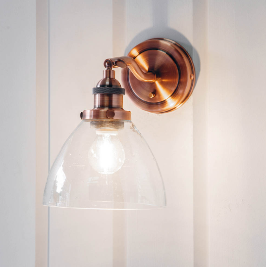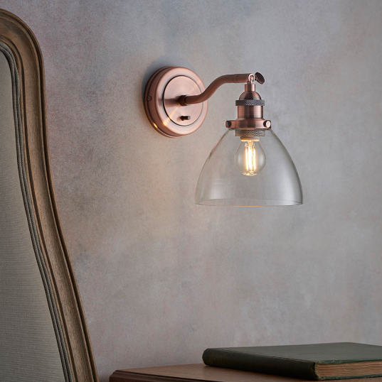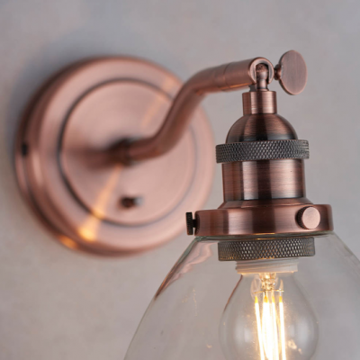 An authentic 'resto' style adjustable wall light, finished in aged copper plating with authentic knurled lamp holder details and clear glass shades. Featuring an adjustable knuckle and accessible on/off switch, pair this wall light with filament LED lamps for that perfect industrial style. The perfect addition for today's stylish homes to create that on trend bar, bistro look.