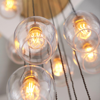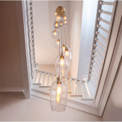 A dramatic addition to this collection, the 13-light cascade pendant is the perfect feature piece for hallways and stairwells. Available in a bright nickel or antique brass finish, with clear or ribbed glass, this fitting is designed to work with a range of interior styles. Pair this fitting with matching items in this collection for a cohesive look. High quality clear blown glass shades Antique brass plated metalwork Height adjustable 0.5 - 3.4 metre twisted grey fabric cable Dimmable Twin with E27 LED filament lamps for that unique 'on trend' look