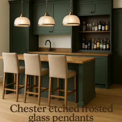 Make an impact using this attractive pendant, fit with a striking combination of antique brass and holophane glass.