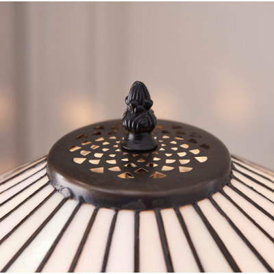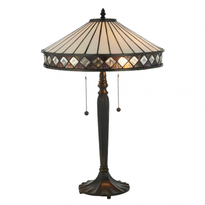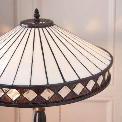 This Tiffany style table light is a beautifully understated design comprising of clean lines and diamond shaped detailing. Teamed with a satin black fitting and compatible with LED lamps. Matching items available for a coordinated look Compatible with LED lamps Supplied with lampholder pull cord Tiffany glass & satin black Constructed from glass & polyester resin