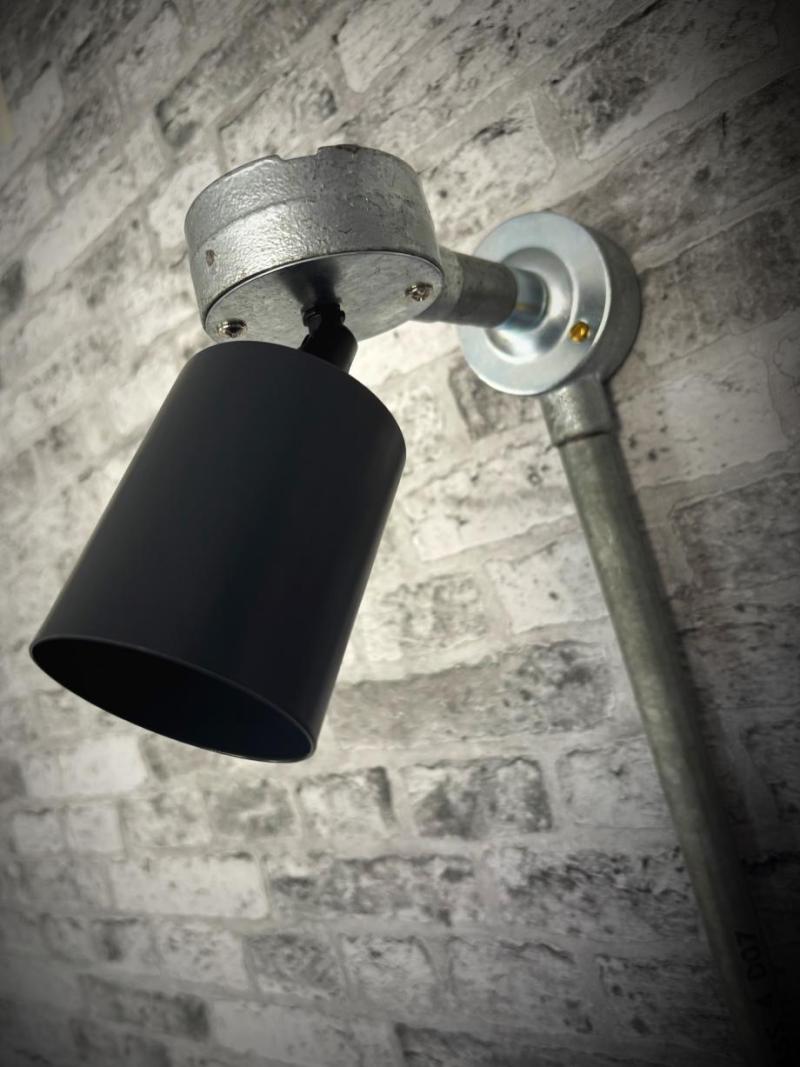 Conduit box adjustable picture/menu grey spotlight. A great industrial simple design, a modern anthracite grey GU10 spotlight fitted to a conduit end box. This is held on a short galvanised arm to bring the light away from the wall. When lighting up artwork, signs, pictures or menus you want the light to be away from the wall and point inwards. This gives you that wash of light over the subject. It would be possible to fit the conduit arm to an angled box or through box, to allow you to continue the run of conduit and connect up multiple lights. Please advise when placing your order if you want to change anything. Each one of these lights is handmade/wired/tested in my Bristol workshop. They take an LED GU10 lamp. Please check out my new narrow beam GU10s and my famous dim to warm LEDS, both would work well in this industrial style spotlight. A brand new design and product for 2025.