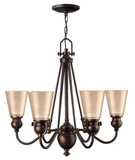 Elstead Hinkely Lighting Mayflower 6Lt Chandelier.Mayflower 4166OB. 6 lt chandelier with unique yoke-mount glass holders with decorative knob detailing.Etched amber glass shades with old bronze finish.HKMAYFLOWER6.6x100w E27