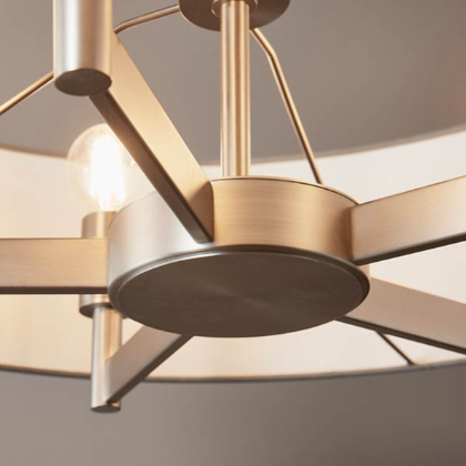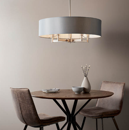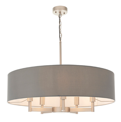 Introduce a refined elegance to your interior with this pendant light featuring a matt nickel finish and stylish, grey fabric. With its clean lines and pared-back look, this highly versatile, five-arm pendant has a pleasing symmetry and welcome simplicity. Matt nickel plated finish. Grey cotton mix fabric shade Height adjustable 1.5 metre chain with black fabric cable Dimmable Perfect for use with E27 LED lamps