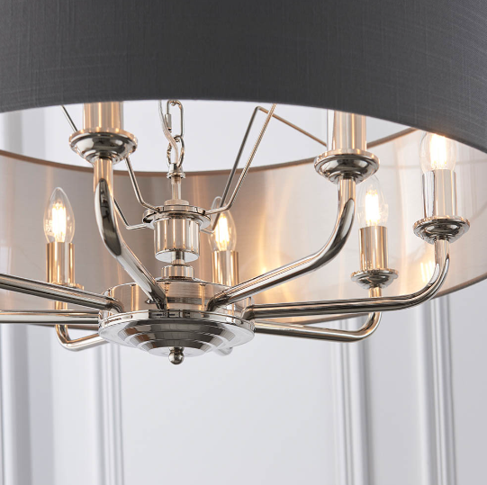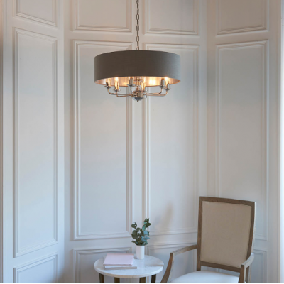 The Highclere pendant is a sophisticated combination of charcoal linen mix fabric with reflective metallic inner and bright nickel plated metalwork. This statement light is the perfect timeless addition to modern and classic homes of today.