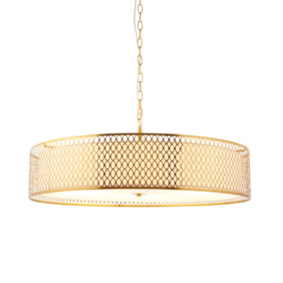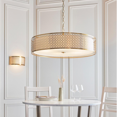 An impressive classic circular pendant with an elegant geometric metal fretwork outer, finished in plated gold effect with an inner fabric shade for lovely light diffusion, complete with a frosted glass diffuser to complete the look. Matching items available. Gold plated effect geometric fretwork White fabric inner shade Frosted glass diffuser Height adjustable chain with 1.5 metre clear flex Dimmable Perfect for use with E27 LED lamps