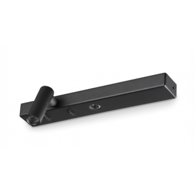 Plated or powder coated metal frame. Double light source: one is fixed and the other is positioned on an adjustable cylinder. Two integrated switches for separate ignitions. Colour: Black.