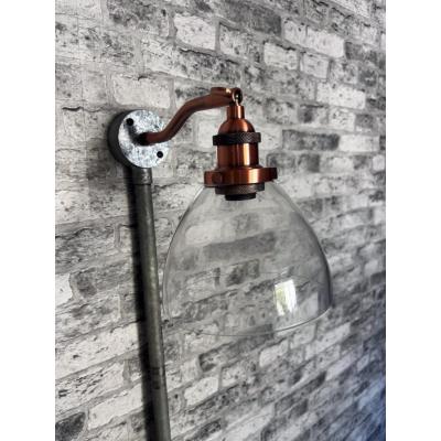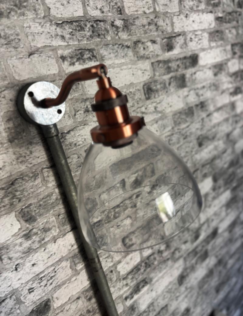 Oxford handmade conduit box light. A gorgeous hand blown 140mm clear glass shade. Fitted to a 200mm aged copper adjustable arm. Complimented with knurled metal detailing. A timless and classic design that would suit a mix of applications. Each conduit light takes an E14 small screw in lamp. Perfect as a bedside reading wall light or over a picture/arwork. Made by hand in my Bristol workshop. Limited stocks.