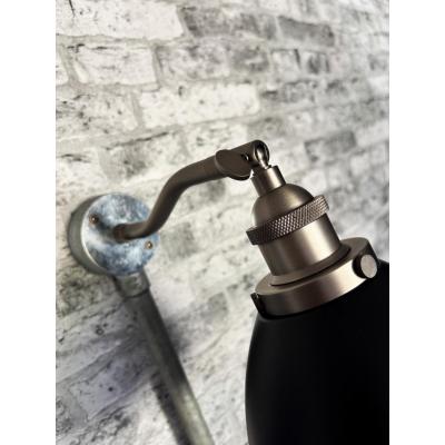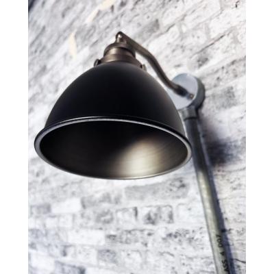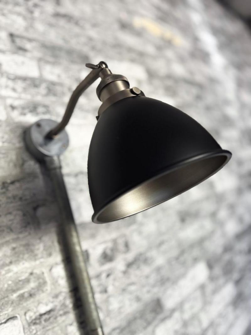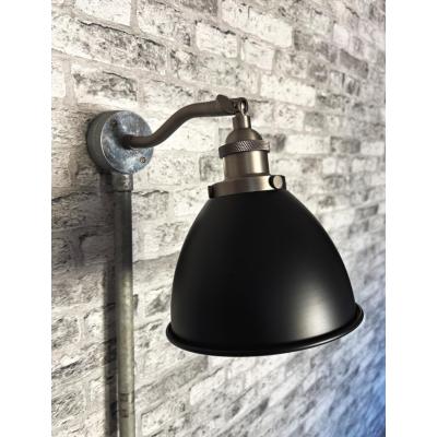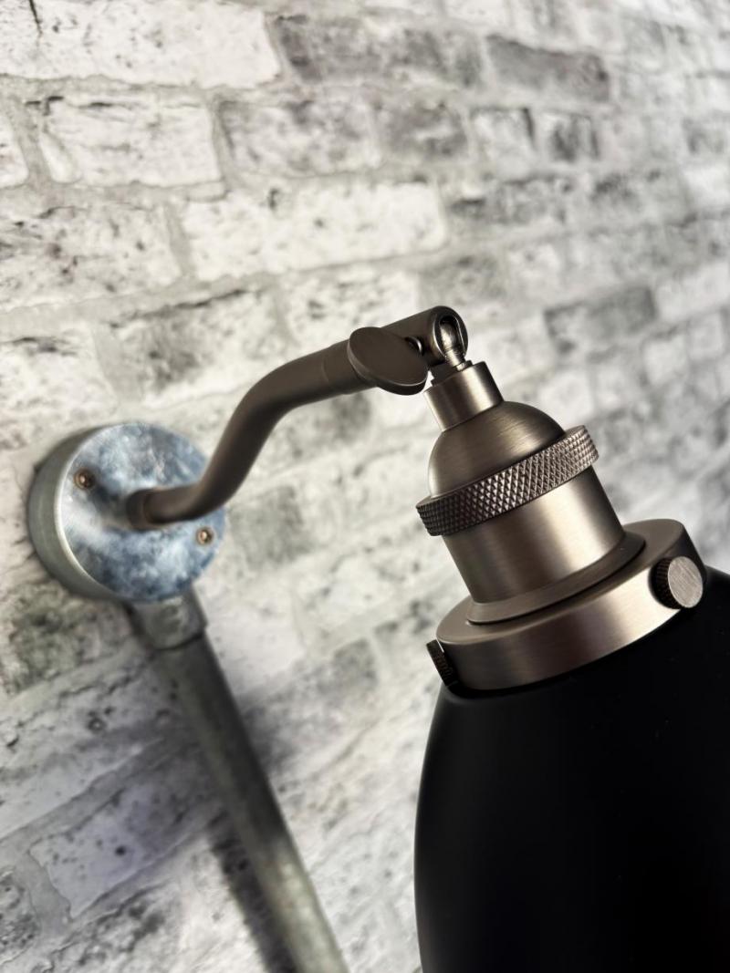 Oxford handmade conduit box light. A gorgeous matte black vowel shaped shade with a brushed nickel inside. Fitted to a 200mm matching nickel adjustable arm. Complimented with knurled metal detailing.