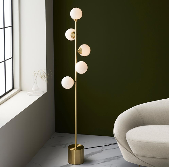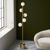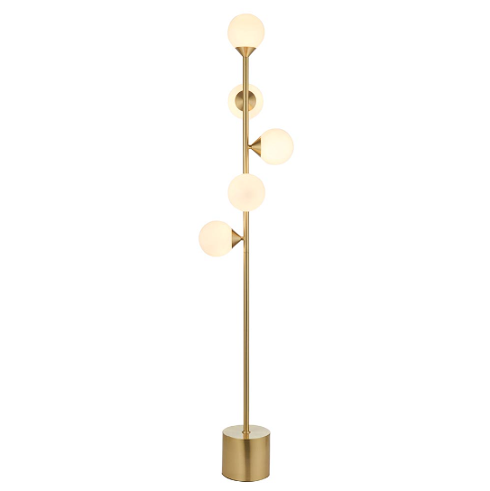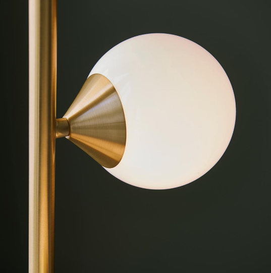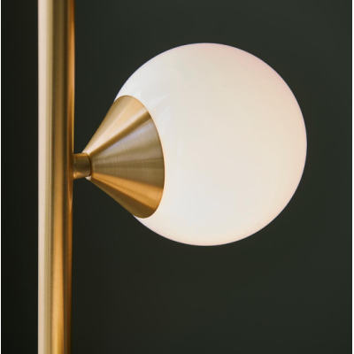 Modern statement floor light with gloss white glass shades set against satin brass. Ideal for lighting up living spaces and creating a cosy atmosphere. Matching items also available. 'On trend' brushed brass finish Beautiful gloss opal glass shades In-line on/off foot switch with 2 metre black flex Perfect for use with G9 LED lamps