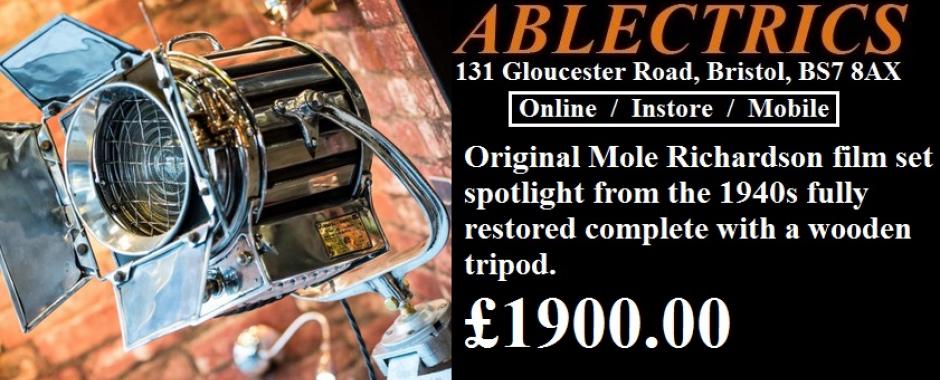 We have acquired an original Mole Richardson 1940s film spotlight. We have fully restored this beautiful light stripping it down, cleaning it and having it professionally chromed. It sits on a beech wood vintage wooden tripod. Complete with the original barn door reflectors this really is a unique vintage light. On or off it looks truly stunning and would suit any high end front room or dining area. View it online now or come down to our lighting showroom in Bristol and view it for yourself.