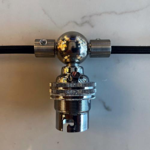 Indoor festoon lampholder BC cap chrome finish. This inline lampholder is designed to be fitted into a length of cable. If you want to run a fabric cable across a room or space and have some lampholders fitted inline this is the answer. Each BC cap holder has two cord grips so the cable passes through, you then use the connections in the holder as a junction. They are metal so you will require an earth. They also come with a twin lock ring so you could fit a shade.