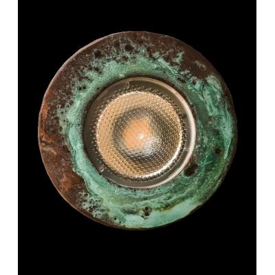 Industrial fire rated downlight ideal for rustic or vintage room sets and interior designs. This downlight comes with a hand finished textured verdigris copper bezel. We follow a process to age the copper over the course of a few days. Once the beautiful green verdigris has taken to the copper we then hand lacquer the bezel to seal the finish. This whole process takes several days and each downlight we produce ages and patinas slightly differently, no two bezels are the same please bear this in mind. They are a gorgeous finish and something we are very proud of. I have shown 3 images of different batches to give an idea of how they patina and change.
