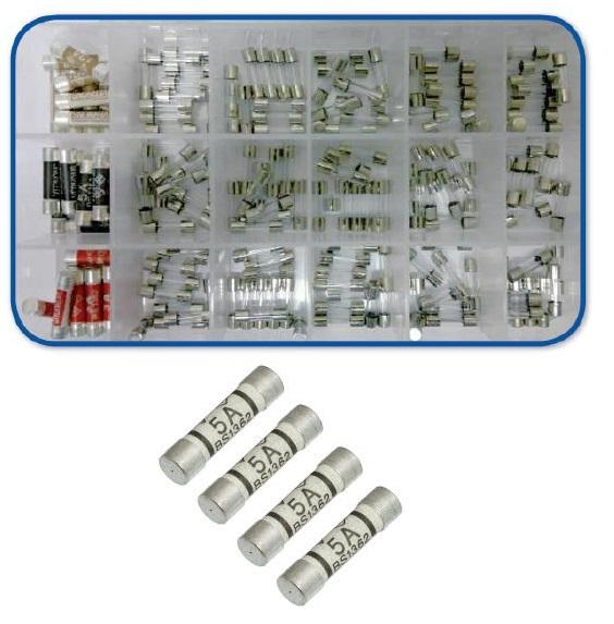 An assortment of fuses and a plastic box with dividers. Ideal for electricians. Never be stuck looking for an odd fuse again.