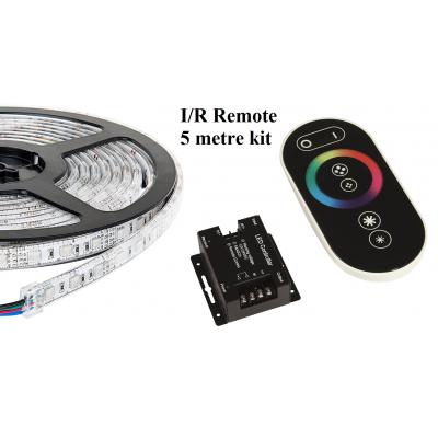 5 metre colouring changing LED tape kit. IP65 rated suitable for bathrooms. Self adhesed tape ideal for kitchens, bedrooms and shelves. Inline driver unit IP44 rated. This premium kit comes with an infa red remote control which does not need line of sight with the driver unit. Cheaper kits have a remote eye and use of the remote to change the colour of the tape can be restricted as the remote needs to be pointed directley at it. This kit can be easily fitted and the driver and control hidden in a cupboard or in the wall.