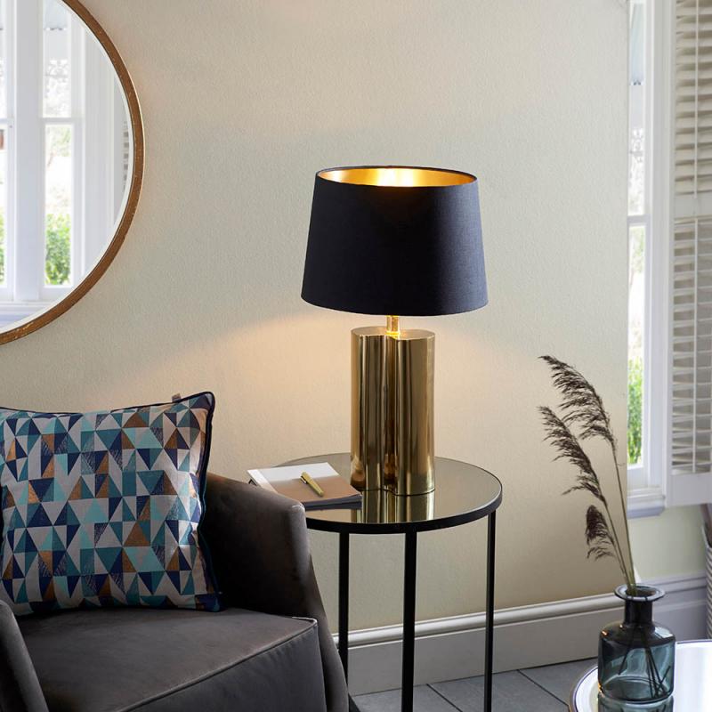 The Amalfi is a bold but luxurious gold effect lamp base, constructed of steel with black cotton shade. 1 x 40w GLS ELD Gold effect finished metalwork Black cotton tapered shade lined with brushed metallic inner In-line on/off switch with 1.8 metre black fabric flex Weight: 3.3 Kg