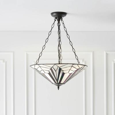 The Astoria large inverted 3 light pendant uses dynamic lines in true art deco style. It uses bevelled and textured glass producing a stunning light effect. -Compatible with LED lamps -Dimmable -Tiffany glass & satin black -Constructed from glass & steel