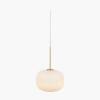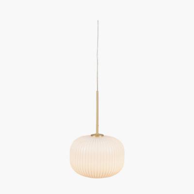 This milky white glass squoval pendant has a delicately ribbed texture and is finished with gold metal detailing for a modern look. Add in a calex bulb for a diffused look and hang alone or in a set to add an element of drama to your room. Also available in clear glass with silver metal.