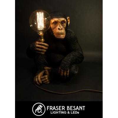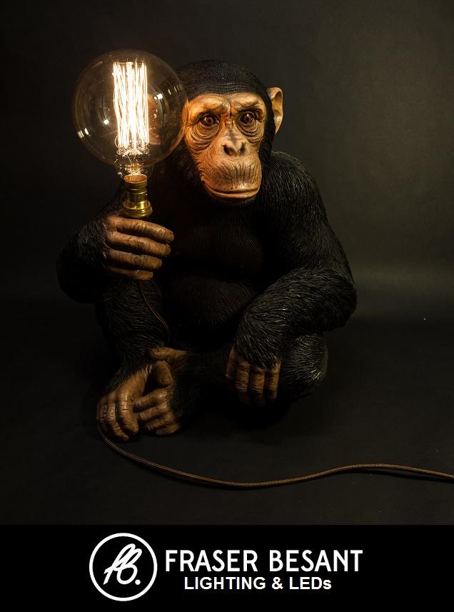 A life sized chimpanzee statement floor light or side light. Ideal for a man cave, games room or a child's bedroom if they love animals. This life like figure is guaranteed to put a smile on your face and is not something you will find on the high street. This light is 550mm tall. Fitted with 2 meters of fabric covered brown cable and a giant globe filament globe or a squirrel cage filament lamp which he hold in his hand. We make these to order in our workshop. Please allow 3-5 days for us to make one up for you and get him delivered. A very eyecatching piece ideal fr anyone who loves monkeys and chimps.