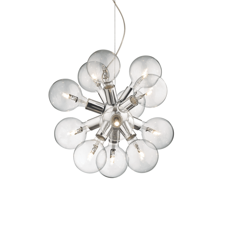 Artistic and stylish tear drop glass shades make up this eyectaching pendant light. Chrome spherical frame and bulb socket cover. Steel cable adjustable in length with automatic blocking devices.This statement piece has a very original look and is suitable for kitchens and living areas. On or off it is a striking piece that will get noticed and draw the eye.