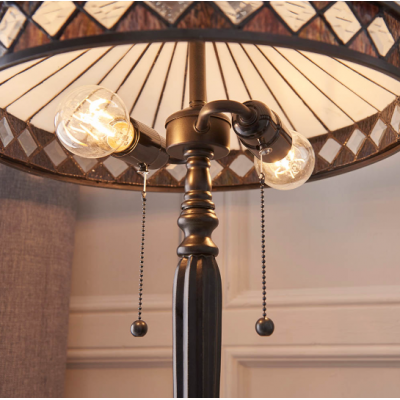 This Tiffany style table light is a beautifully understated design comprising of clean lines and diamond shaped detailing. Teamed with a satin black fitting and compatible with LED lamps. Matching items available for a coordinated look Compatible with LED lamps Supplied with lampholder pull cord Tiffany glass & satin black Constructed from glass & polyester resin