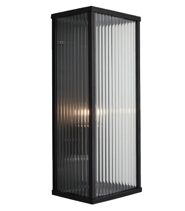The Dusk Holophane ribbed glass wall light is a modern twist on a classic box lantern. The ribbed glass provides a striking light when paired with a LED Squirrel cage lamp. The black stainless steel frame nicely complements the ribbed glass front and sides and as the fitting is slightly oversized for the box lantern style it really becomes a focal point. This fitting can be used in both modern and more traditional settings and is sure to provide a lovely feature.