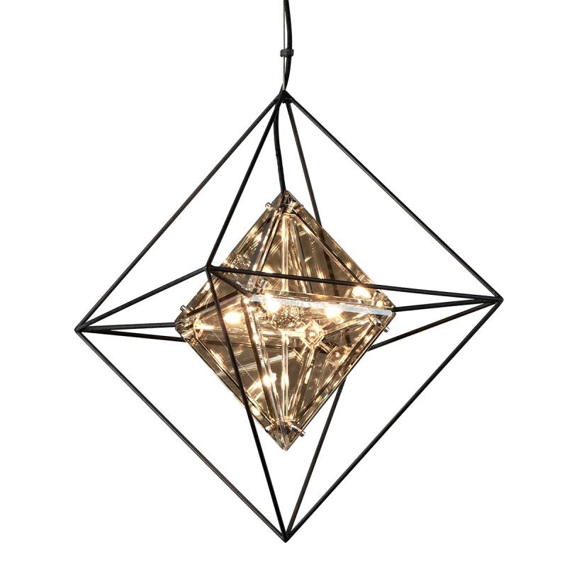 Lights are sprinkled throughout the interior of Epic’s diamond-shaped, plated topaz prism, producing a dazzling effect. When turned on, the glass diffuses the glare, and when turned off, the plated quality of the glass creates a subtle yet stunning appeal. Finished in forged iron, the exterior hand-worked iron frame creates a simple silhouette, accented by polished chrome details.