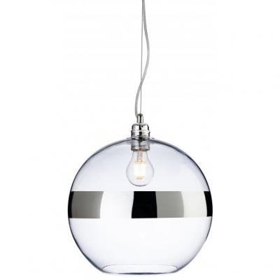Firstlight Saturn single light ceiling pendant features a circular ceiling plate in polished chrome finish with clear cable, holding a clear glass globe shaped shade with chrome effect central ring.