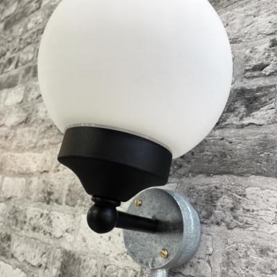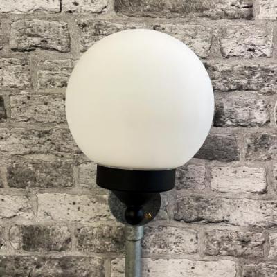 Frosted glass ball with a matte black arm fitted to a standard 20mm conduit end box. these retro inspired wall lights would suit any urban or industrial design. The lights are designed to point upwards and sit on top of a conduit box, should you wish to point them the other way around, facing down then the conduit pipe would need to drop from the ceiling. They are designed to fit a small LED Golf ball e14 lamp. This is sold separately. To discuss a bespoke conduit lighting design please contact us. We can make up spotlights, track and dimmers using galvanised conduit. We can even powder coat it should you want a special colour.