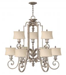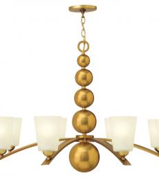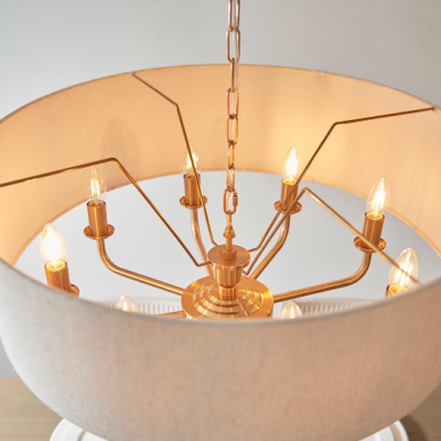 The Highclere 8 light pendant is a sophisticated mix of a single large natural linen fabric shade, with matching colour cotton inner and vintage brass plated metalwork. This statement light is the perfect timeless addition to modern and classic homes.
