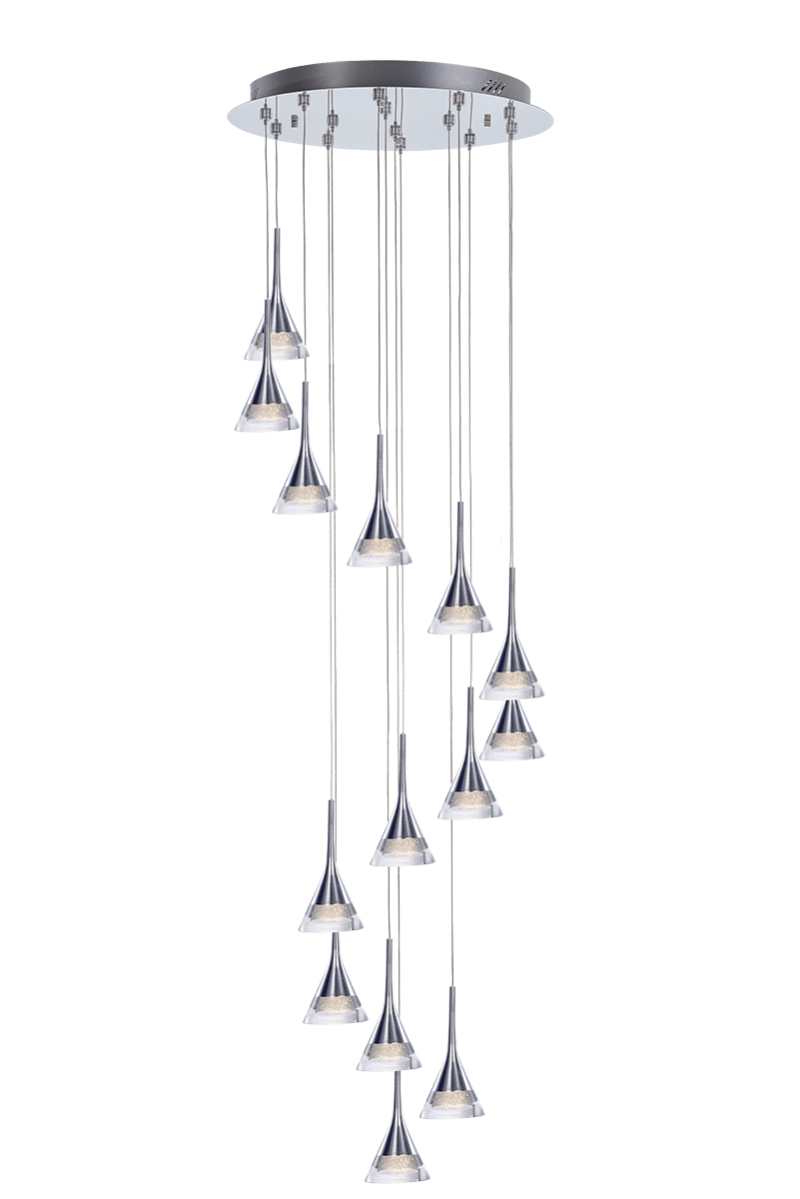 Illuminati Lighting Jewel 14 Light LED dimmable spiral ceiling pendant features a circular ceiling plate in a polished chrome finish with thin suspension wires holding 14 polished chrome and suspended diamond dust shades. Dimensions: Diameter 510mm x Height 3000mm