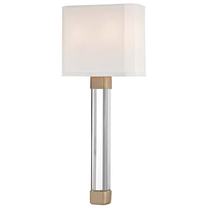A long and thick arm of faceted crystal supports the shade-covered bulb in our Larissa family. The faceted crystal rod is fit snugly into metal pieces in the same shape at top and bottom.