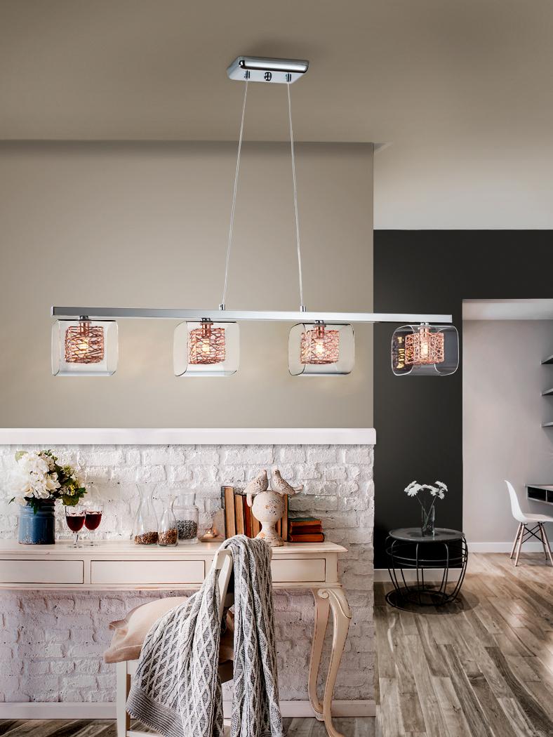 This Lios Lamp has 4 lights, is adjustable in height, made of metal, chrome finish. Molded glass shades, inner cubic frame of copper wire. A nice statement piece suitable for above kitchen Islands or dining tables.