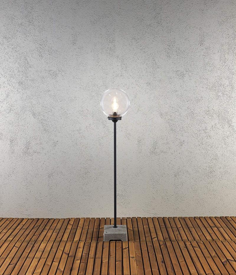 Lodi outdoor modern floor lamp with clear glass shade. The Lodi floor lamp is a perfect choice for the conservatory, lounge and garden. Constructed from aluminium with a matt black finish and a clear acrylic glass globe, complete with ground spike and 5 metres of cable.Modern design ideal for use with a decorative filament LED lamp. 1.29 metres tall
