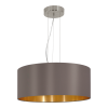 Maserlo Large Cappuccino Fabric Pendant light, ideal in a bedroom or lounge room. The soft fabric shade is a welcome addition of colour with its stylish gold inner detailing this is a very attractive modern light. We have used these many times on our lighting designs and one of these possitioned over a bed really sets the room off.