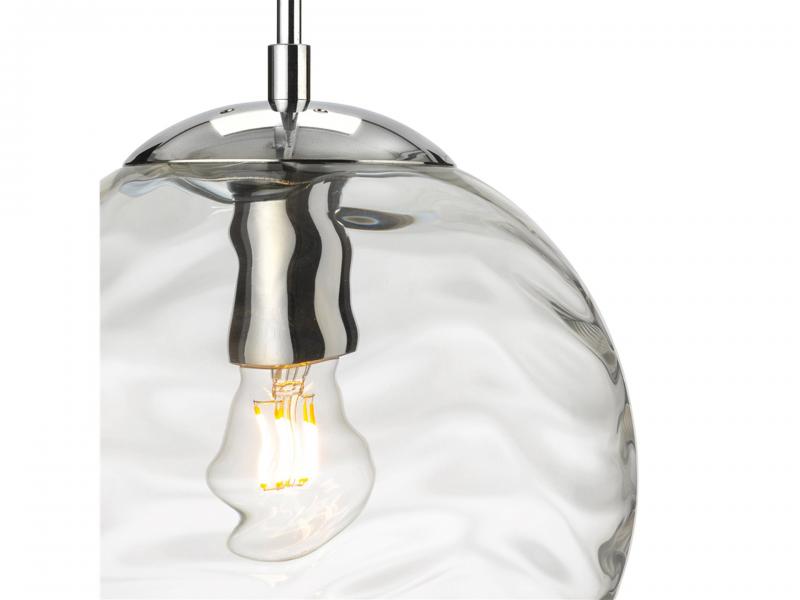 Stunning clear glass pendant which features a decorative wave type effect to create a unique look. Topped by shiny chrome metalwork and ceiling cup.