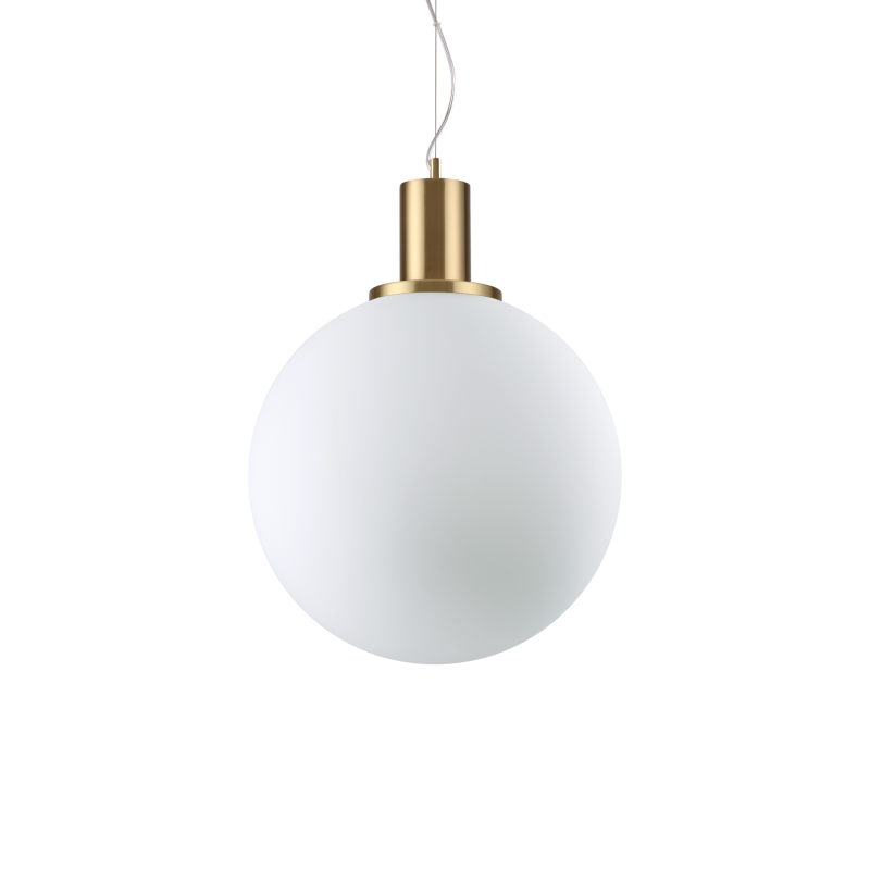 Opal glass , italian made IP20 rated pendant light, Minimal sleek design, perfect for modern kitchens and living areas. Adjustable cable. Metal frame with satin brass finish. White overlay acid-etched blown glass diffuser.