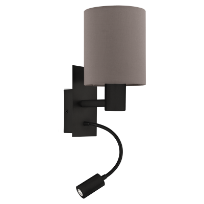 The PASTERI wall light features a black metal wall mount and a round fabric lampshade with an anthracite brown finish. The wall light has an adjustable reading light, which produces a pleasant warm white light and provides focused lighting perfect for reading. With its simple design, the product blends seamlessly with almost any interior design trend. The wall light can switch on and off easily using the rocker switch on the body. Whether in the bedroom or living room, the light provides cosy and practical lighting for your living space. The lightbulb is not included. The product has an E27 lamp holder and requires an E27 lightbulb.