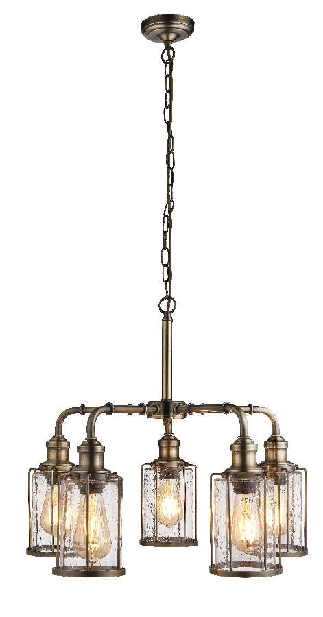 A simple glass 5 light with a rustic bubbled finish to the glass and an antique brass trim.