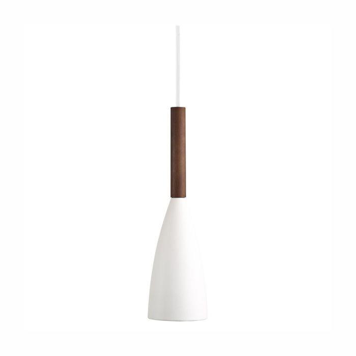 Pure White Metal Pendant with a subtle walnut wooden top. A stylish and minimalist design with a vertical piece of flat metal with a sleeve in oiled walnut. Simple Scandinavian design, minimalist and great quality.