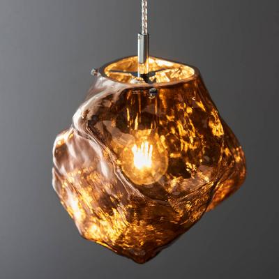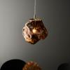Inspired by volcanic rock formations, this statement pendant in metallic copper glass emits an attractive ember glow and features an adjustable clear flex allowing you to alter the height. Perfect when paired with LED filament lamps 1 x 10w E27 GLS Modern contemporary pendant Metallic copper glass shade Chrome plated metalwork Height adjustable 1.2 metre twisted clear flex