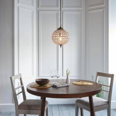 Single ceiling pendant with a dome shaped cage shade suspended by a decorative chain, all in an antique brass finish with clear glass bead detail. Height adjustable at time of fitting. 1 x 60w GLS LED Antique brass plate & clear glass Constructed from steel & glass Weight: 2.9 Kg