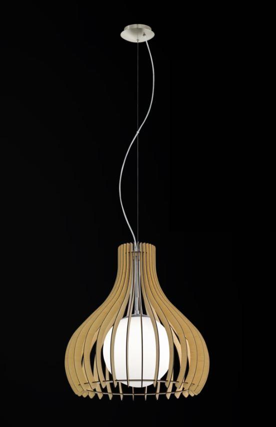 This Eglo Tindori one light ceiling pendant light is finished in wood, glass, maple and white. This striking light is available in a number of sizes and finishes, with this one having a diameter of 500mm. The bell shaped shade is constructed from slatted pieces of wood, allowing the glass lamp holder to be clearly visible.