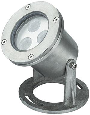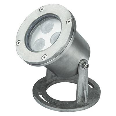 Miniature waterproof low voltage LED lighting fixture within a stainless steel housing on tilt adjustable mounting ring. 3 powerful LEDs produces full colour mixing for decorative light effects in water features and marine areas.
