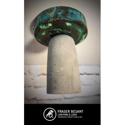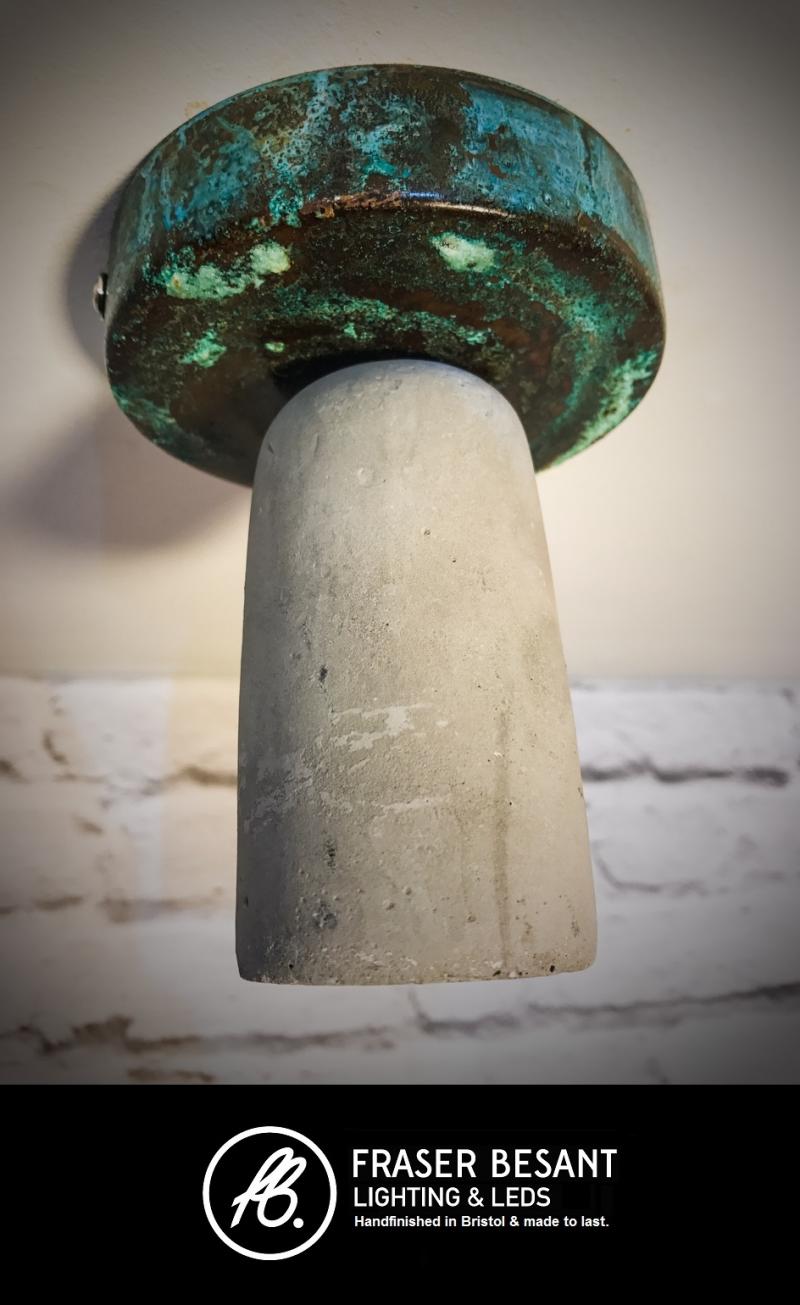 A handmade verdigris copper industrial E27 baton holder complete with a concrete lamp holder. Ideal for use as a wall light, or in a loft or basement when the ceiling height may not be great. The overall height of this fitting with a decorative light bulb included is only 175mm. To create this natural aged effect takes several days to break the copper finish down, once the patina has set in we then lacquer the holder and fixing plate by hand to seal the finish. This is a very unique and beautiful verdigris patina finish and each one we make is slightly different. They each age slightly differently and this adds to the character of the finished lighting design.