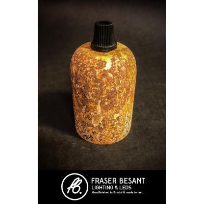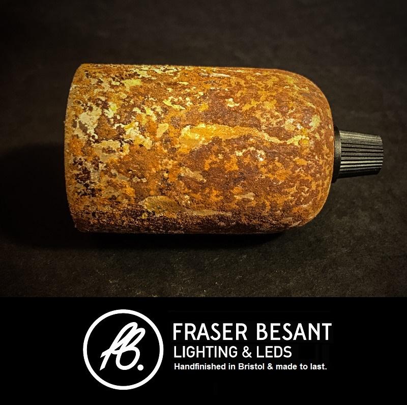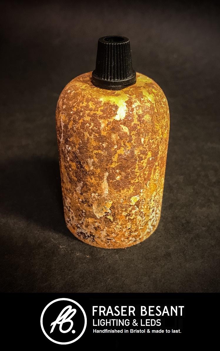 A beautiful hand finished rusted metal E27 lampholder. To create this aged effect takes several days to break the raw metal finish down, once the rust has set in we then lacquer the holder by hand to seal the finish. This is a very unique and beautiful patina finish and each one we make is slightly different. They each age slightly differently and this adds to the character of the finished lighting design. We also supply ceiling hooks and ceiling roses in the same effect. Each holder is supplied with a black cord grip and E27 internal lampholder. This is made in Bristol by our workshop.
