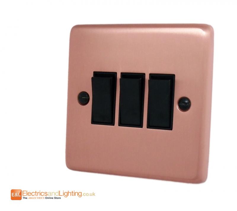 Aged copper 3g 2w light switch ideal for industrial or vintage interior designs. We have this range on display now in our showroom. It has a slightly raised front, meaning you dont need 35mm deep back boxes to accomadate the cables. These will fit into a standard 25mm deep backbox. They are a very stylish finish and not many suppliers are offering this colour. Please allow 3-4 days for us to get this made in the workshop and delivered to site.