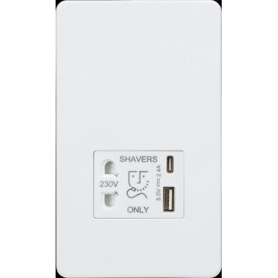 Matt white Shaver socket with dual USB A+C (5V DC 2.4A shared), white insert